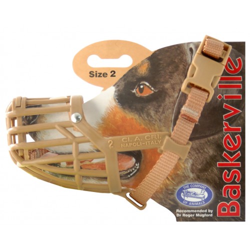 Baskerville Muzzle because not all dogs are angels! Some are unreliable in the company of other dogs other try to eat postmen and some like to vacuum up unmentionable things in the park! Safety must be our primary concern but not at the expense of welfare. The lightweight basket design of the Baskerville muzzle gives all round protection but still allows unrestricted panting and drinking. Your dog feels comfortable and you have the security of being able to decide what should go in his mouth! The range is made from soft plastic mesh which is lightweight and washable. The Baskerville Muzzle is a classic box-design muzzle and is particularly suited for dogs with narrow noses. Key points: Humane comfortable safe. Permits panting and drinking. Made from soft plastic mesh. Lightweight and washable.