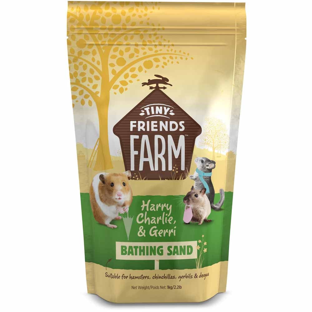 Tiny Friends Farm Bathing Sand  ( 1kg ) for Chinchillas, Hamsters, Gerbils and Degus . Tested for perfect grain size and density, this bacterially clean sand ensures a dust free environment for chinchillas, hamsters, gerbils and degus during their daily bathing activity. The soft grains of sand are the perfect size to penetrate their fine fur structure ensuring healthy & clean skin & coat condition.